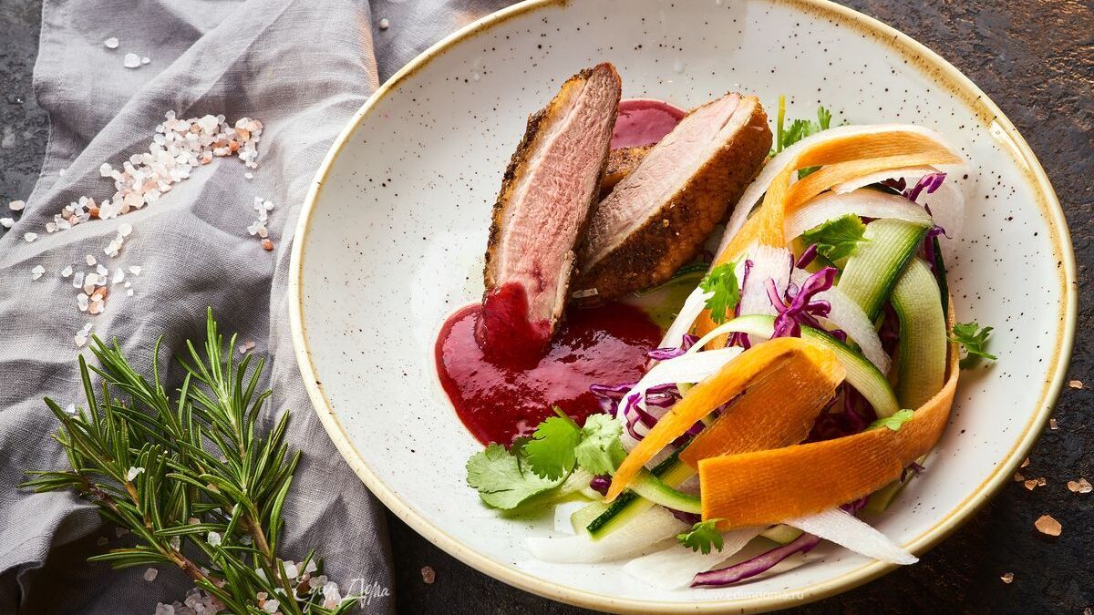 Утиная грудка с соусом из красной смородины — изысканное блюдо, которое впечатлит ваших гостей. Соус из красной смородины придаёт мясу яркую кислинку и делает вкус более насыщенным. Такое блюдо отлично подойдёт не только для романтического ужина, но и для праздничного стола. Попробуйте подать утиную грудку с овощами-гриль — цуккини, морковью и дайконом, чтобы сбалансировать вкус. Соус из красной смородины также хорошо сочетается с другими видами мяса, так что вы можете экспериментировать и создавать новые гастрономические сочетания.