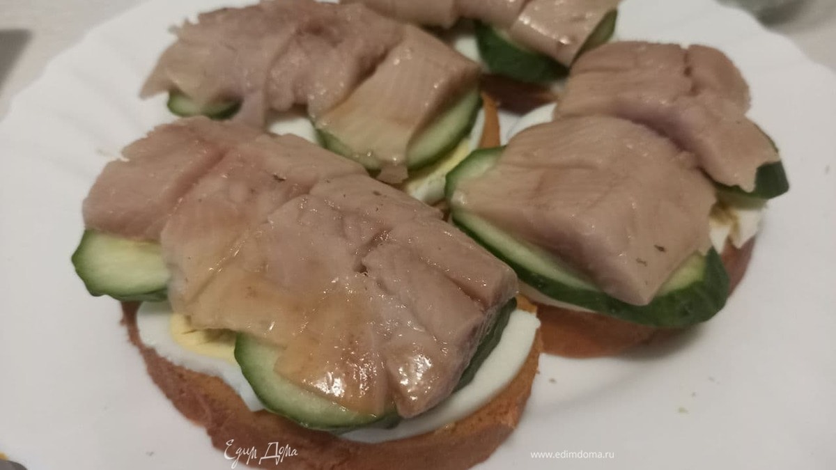 И в завершение выкладываем кусочки сельди поверх огурца. Бутерброды готовы! При желании украсить зеленью.