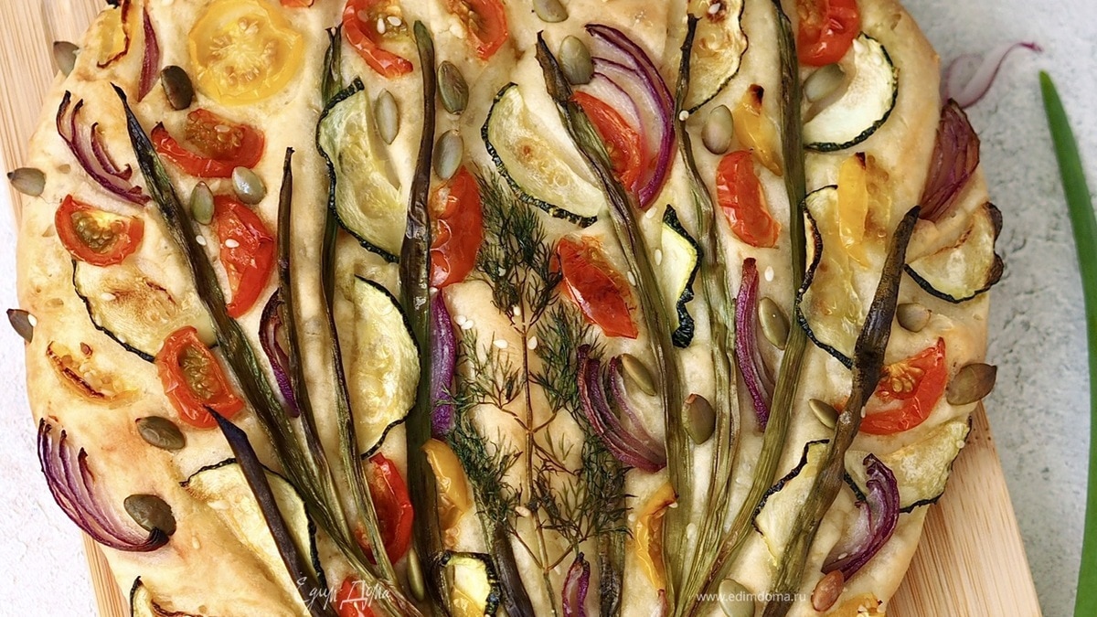 Спустя время подошедшее тесто обмять, раскатать в виде круглой лепешки, переложить на противень, застеленный пергаментом, и отставить на 20 минут. В это время разогреть духовку до 220°C. Подошедшее тесто сбрызнуть оливковым маслом, разложить сверху, слегка утапливая, свежие овощи и зелень в виде фантазийного рисунка. Овощи также сбрызнуть оливковым маслом.