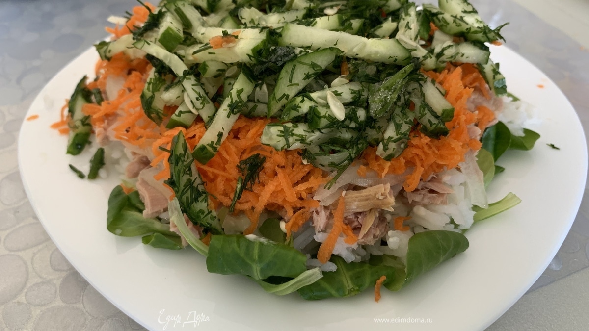 — тунец, лук, морковь, огурец и укроп. Приятного аппетита!