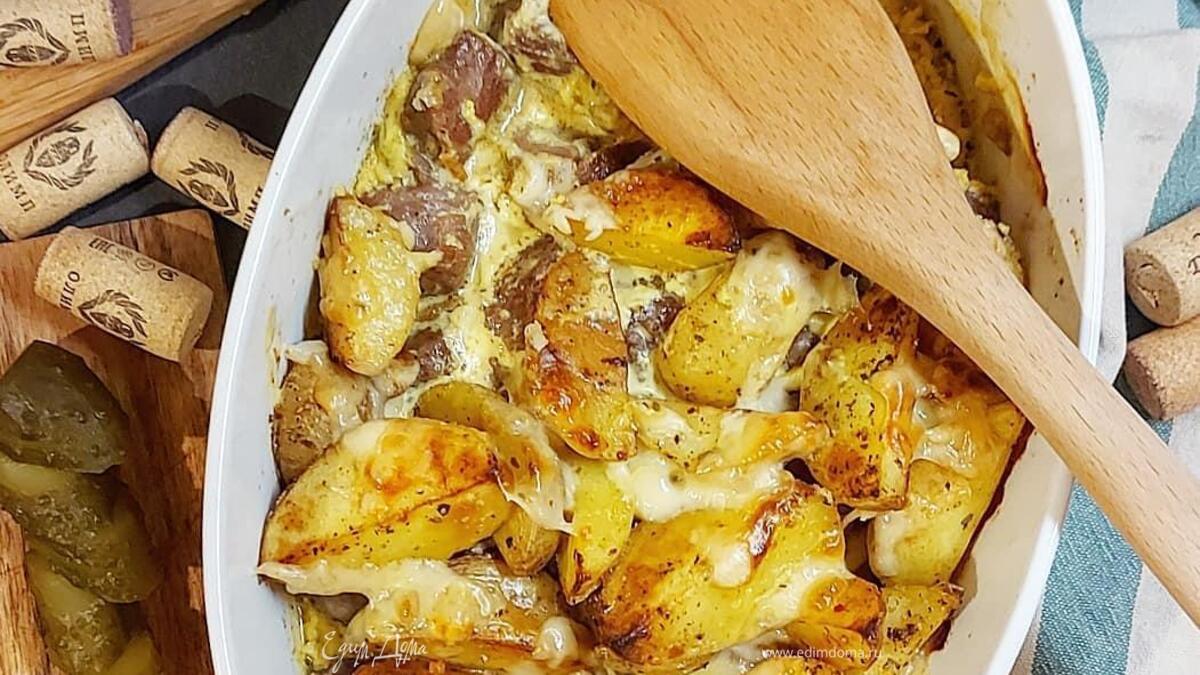 Проваренный картофель нарежьте на дольки. Подлейте в сковороду, где жарилось мясо, еще немного масла. Обжарьте картофель, поперчив, посолив немного, дав, по необходимости, любимых специй, до золотистой корочки. Переложите его поверх мяса в форму для запекания.
