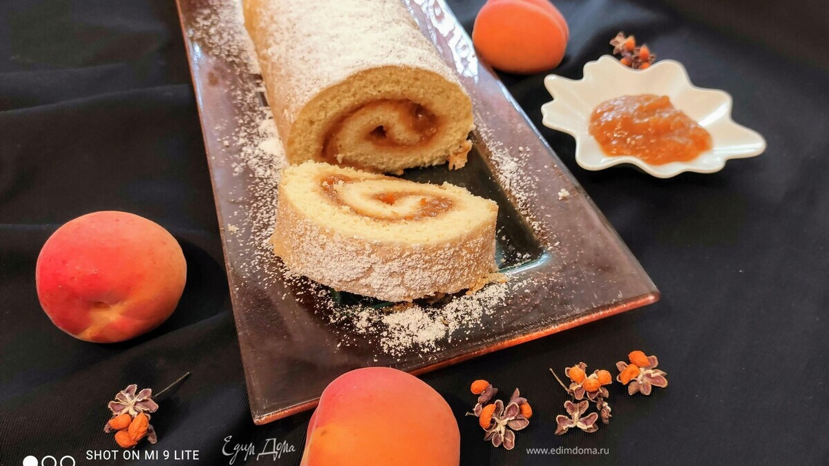 Распределить бисквит толщиной около 1 см на противне, выстланном бумагой для выпечки, и выпекать в духовке около 10 минут. Вынуть бисквит вместе с пергаментом и сразу же перевернуть его на еще один лист пергамента, посыпанный сахарной пудрой, так чтобы бумага для выпечки оказалась сверху. Аккуратно снять верхний лист бумаги и смазать бисквит остывшим абрикосовым мармеладом. При помощи нижнего пергамента свернуть бисквит в рулет и охладить в холодильнике в течение двух часов. - Шаг 4