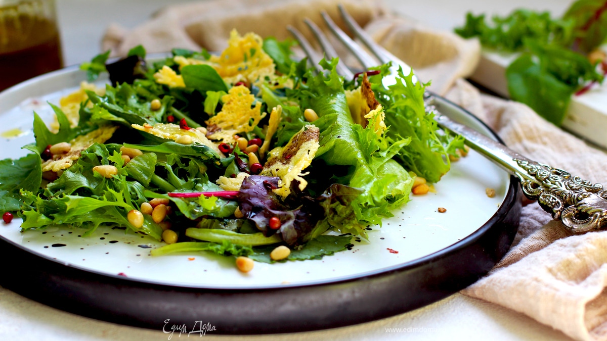 Легкий зеленый салат с хрустящими чипсами из пармезана. Делается моментально! Подавайте как самостоятельное блюдо или как дополнение к мясу.