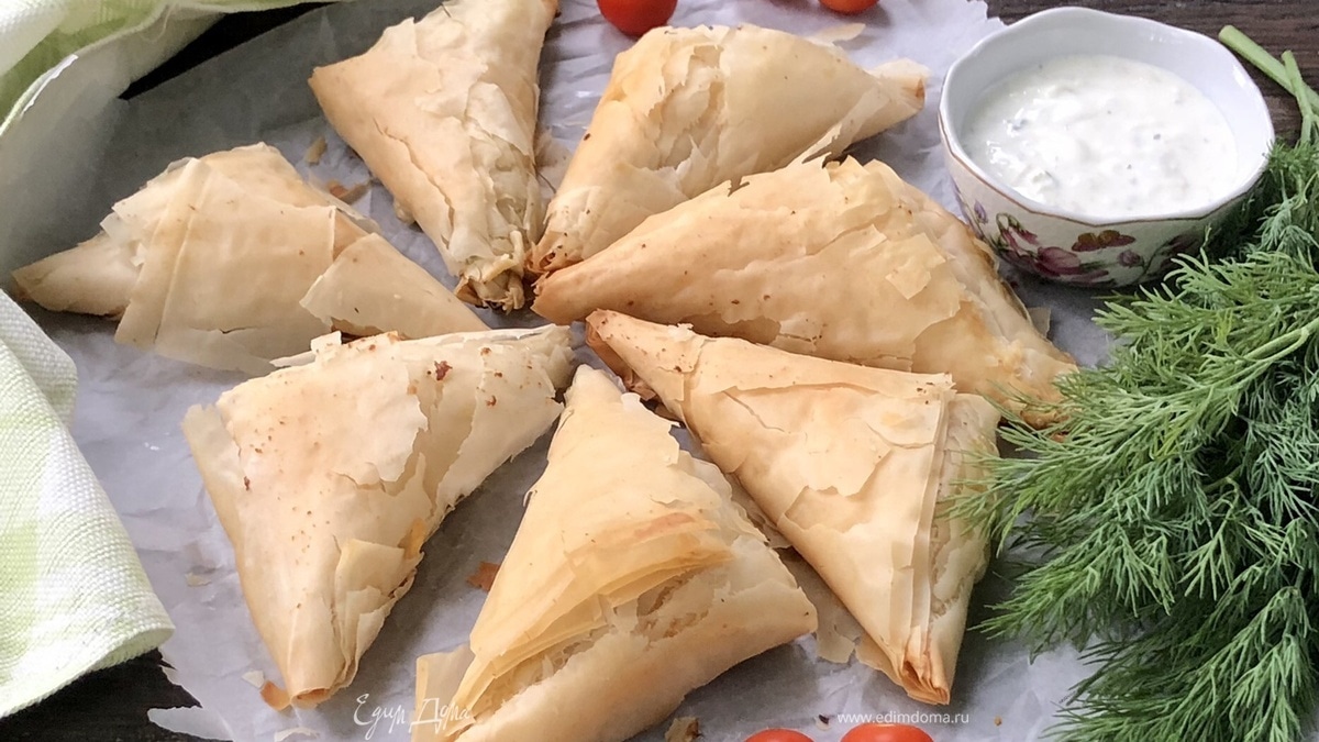 Хрустящие пирожки из тончайших листов теста фило, которое дает воздушные слои. Пирожки можно макать в сметанный соус, так как брынза чуть солоновата.