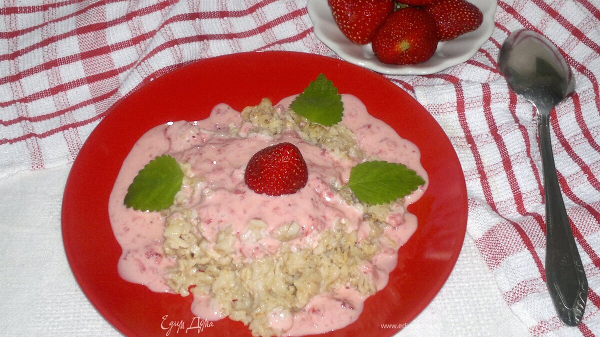 Обычная овсянка на завтрак превратится в яркое, почти праздничное блюдо. Для этого полейте ее сметанно-клубничным кремом, украсьте клубникой и мятой. Быстро, просто и очень вкусно!