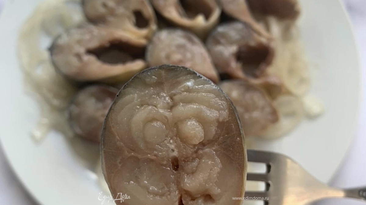 Скумбрию очищаем, убираем внутри потроха и черную пленку. Отрезаем голову и хвост, они нам не понадобятся. Нарезаем на средние кусочки. Лук нарезаем на тонкие полукольца. - Шаг 3