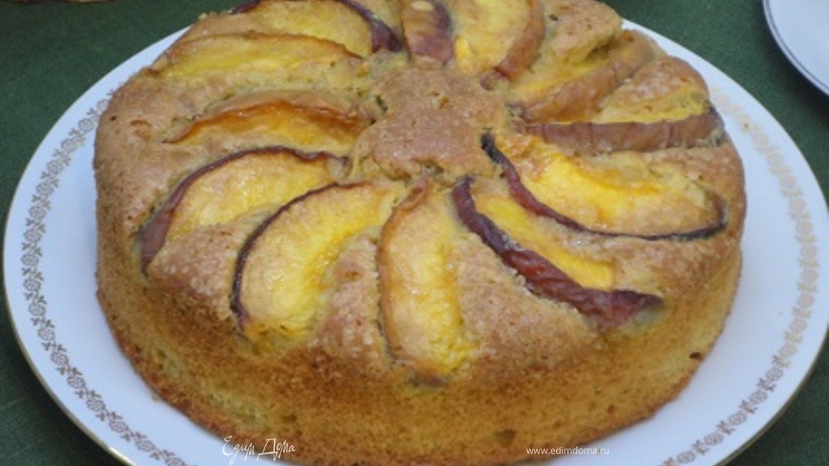 Сверху выкладываем персики. Выпекаем 35–40 минут. Ориентируйтесь по своей духовке и проверяйте готовность деревянной шпажкой. - Шаг 6