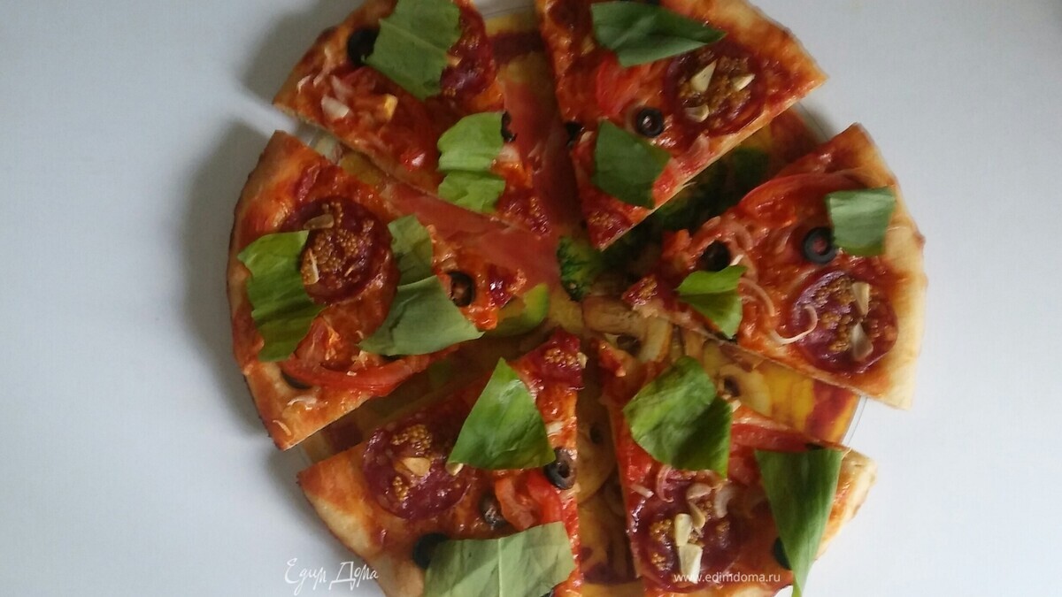 Разогреваем духовку до 200°C и ставим в нее противень с пиццей на 20 минут (время приготовления зависит от вашей духовки). Готовую пиццу перекладываем на блюдо, украшаем кусочками листиков черемши (ее можно произвольно порвать руками). Подавайте пиццу к столу. Приятного аппетита!
