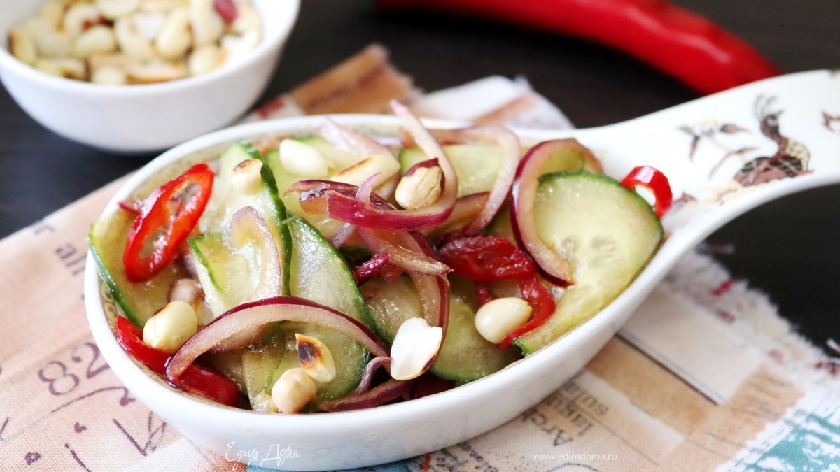 Легкий и пикантный салатик из огурцов довольно популярен в Таиланде. Салат несложный и весьма вкусный, а благодаря заправке и арахису приобретает азиатский колорит. Такой салатик хорош к любому мясному или рыбному блюду.
