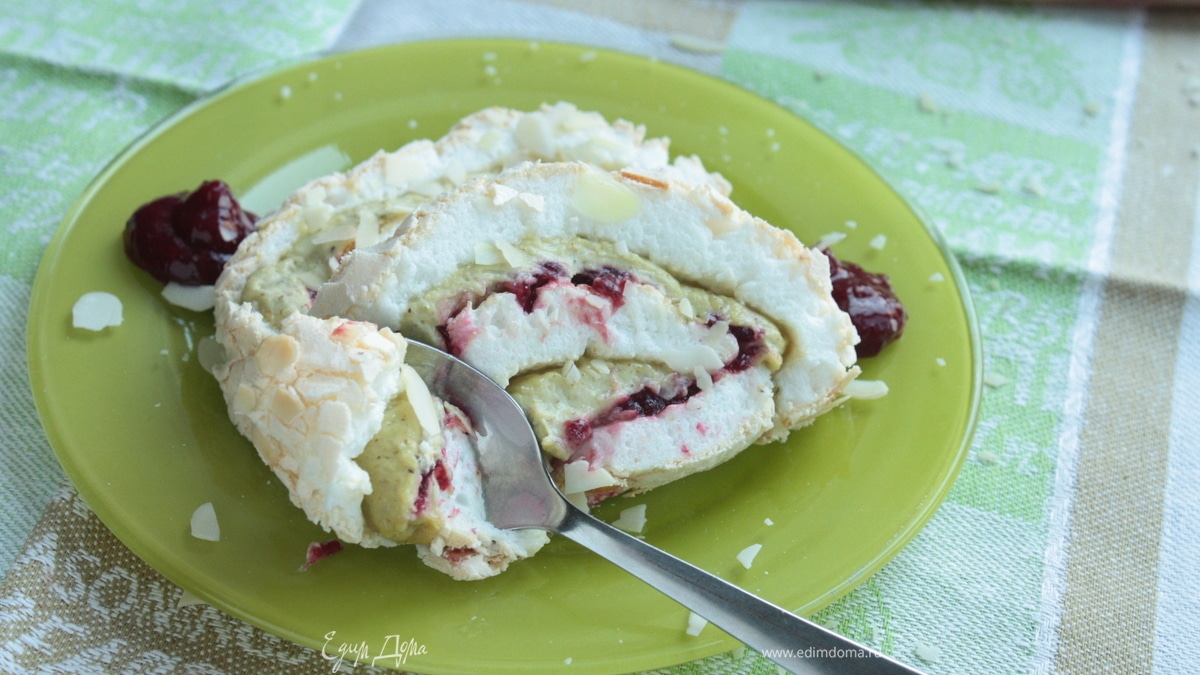 Если вам хочется легкого и нежного летнего десерта, который также можно подать и на завтрак, меренговый рулет — отличный вариант! Вместо фисташкового крема можно сделать простой ванильный крем, можно добавить в начинку какие угодно ягоды: черешню, клубнику, смородину, чернику.