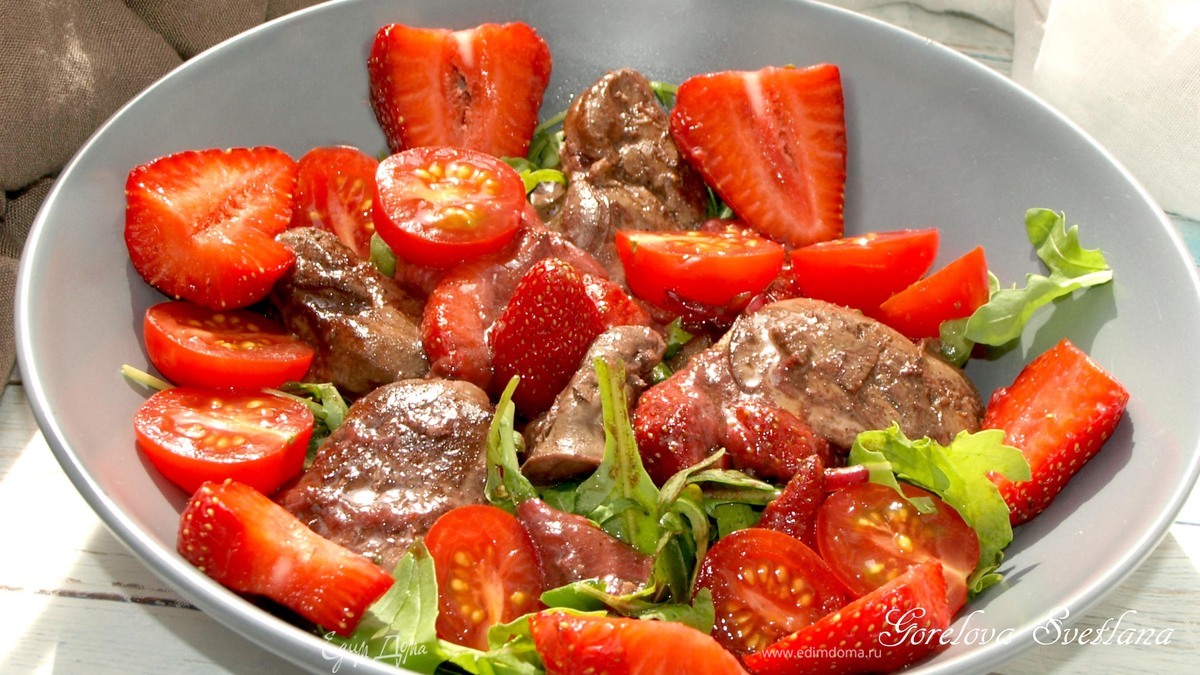 Теплый салат с куриной печенью и клубникой