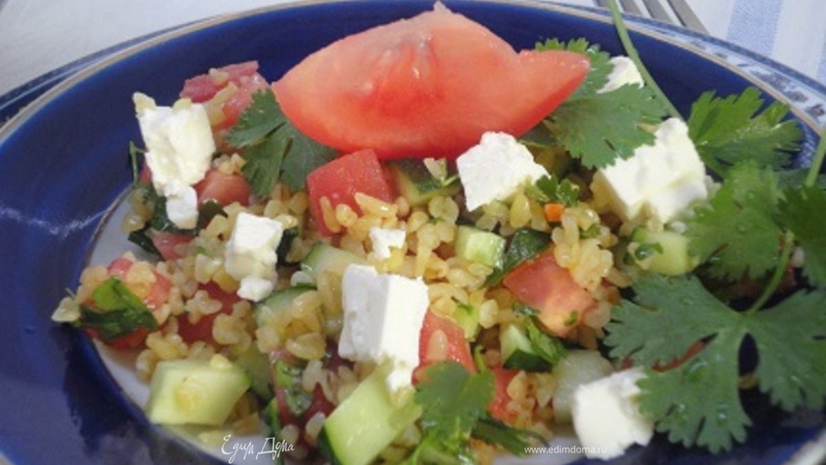 В сотейнике доведите до кипения бульон (можно из кубика или порошка), всыпьте булгур, накройте крышкой, отключите нагрев и оставьте на плите на 15 минут.