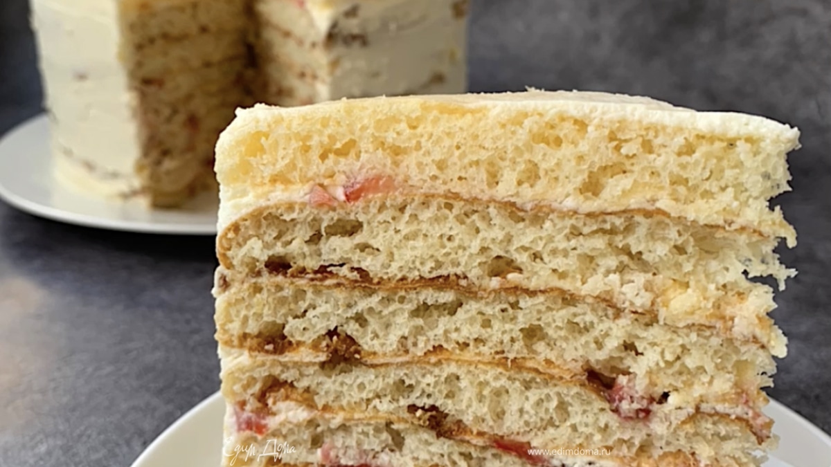 Такой легкий и нежный торт. Тонкие воздушные коржи со сливочным кремом и клубникой.