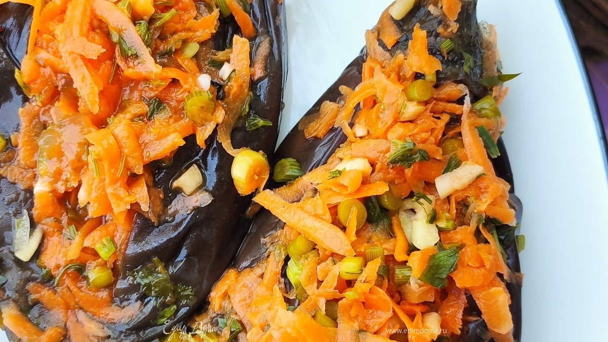 - Шаг 1Берем баклажаны и кладем их в кастрюлю, наливаем воду, кладем 2 ст. ложки соли, доводим до кипения и варим 10 минут. Морковь натерла на крупной терке, мелко нарубила зелень и чеснок. Добавила 1 ст. ложку соли. Пробуйте на вкус, если любите более соленое, добавляйте больше. Всю смесь хорошо отжала.
