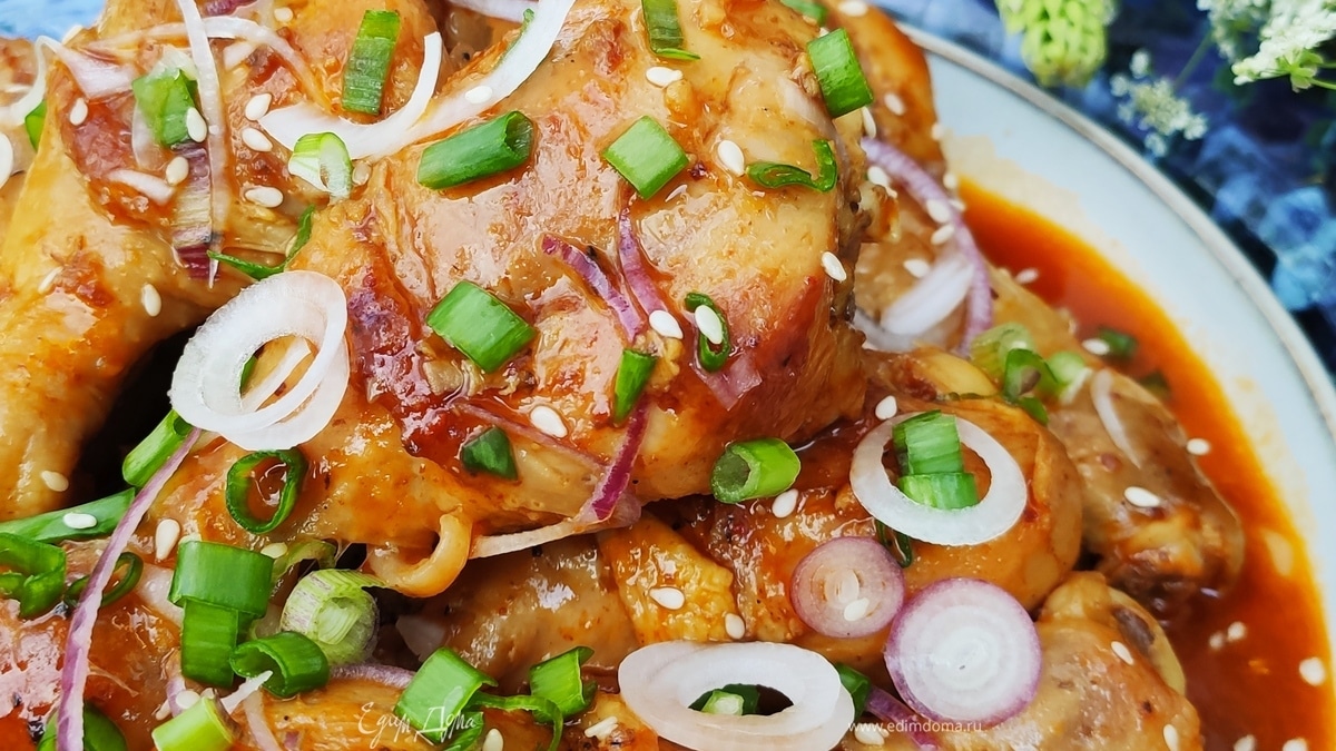 - Шаг 2Голени обжарила на сливочном масле до румяной корочки, курицу выложила в миску. В масло от курицы добавила кетчуп и соевой соус. Выложила в соус курицу и под крышку на час. Перед подачей на стол посыпала чесноком и луком с кунжутом! Приятного аппетита!