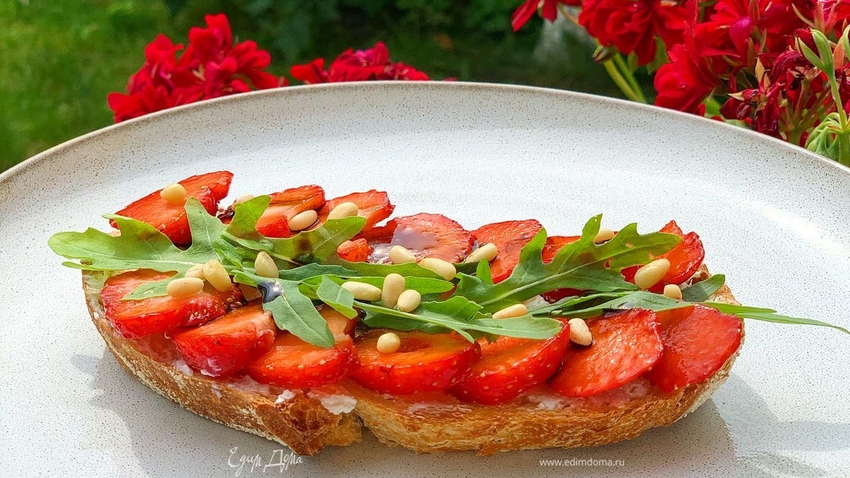 - Шаг 2Режем клубнику кружочками и укладываем на сыр. Затем небрежно бросим горсть руколы и немного кедровых орешков. Сбрызнем бальзамическим соусом и подаем на завтрак.