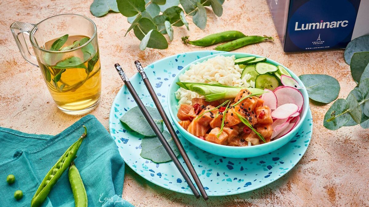 Выложите в глубокую тарелку Luminarc рис, кубики лосося, измельченные огурцы, редис. Посыпьте рыбу кунжутом и рубленым зеленым луком. - Шаг 6