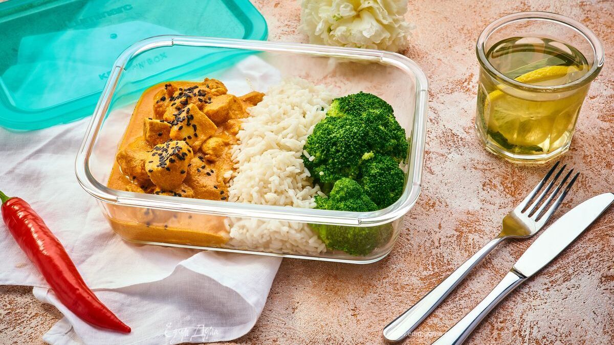 Выложите в три ряда курицу карри, рис и брокколи. Посыпьте курицу кунжутом. - Шаг 10