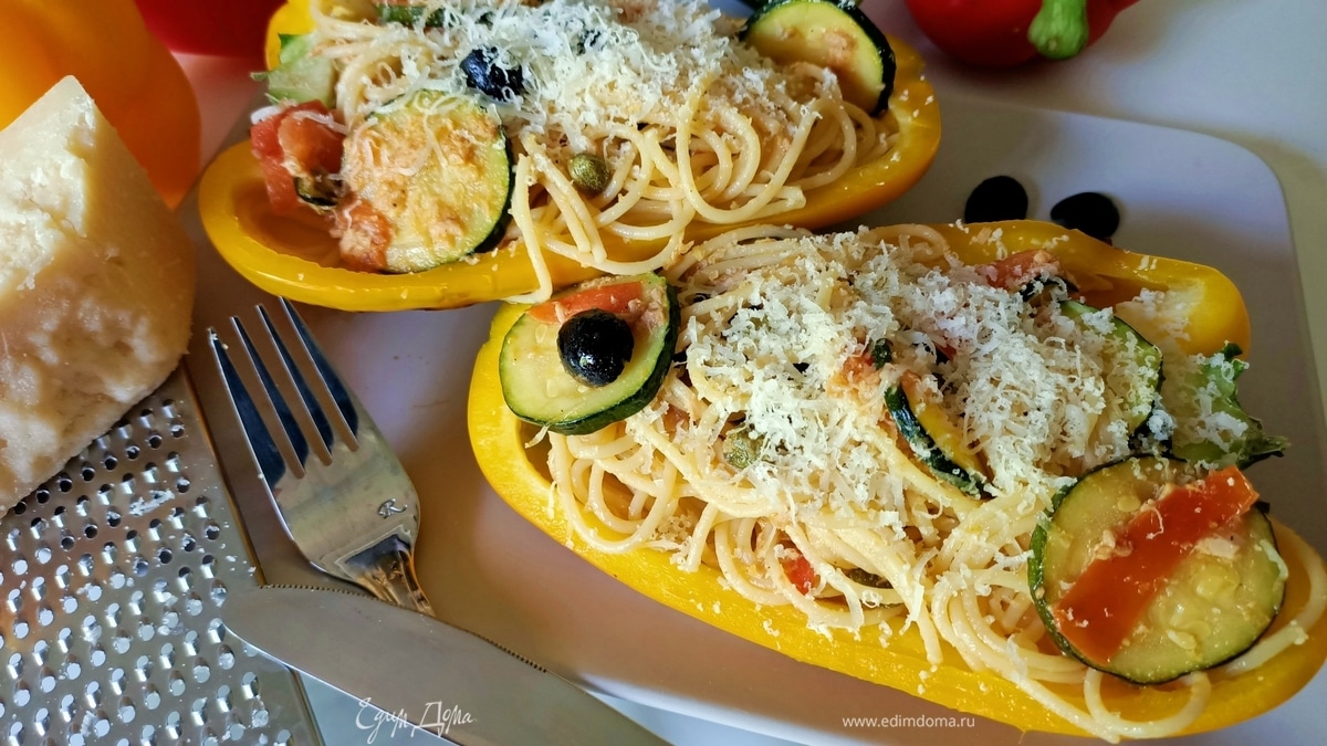 Спагетти с тунцом и овощами в болгарском перце