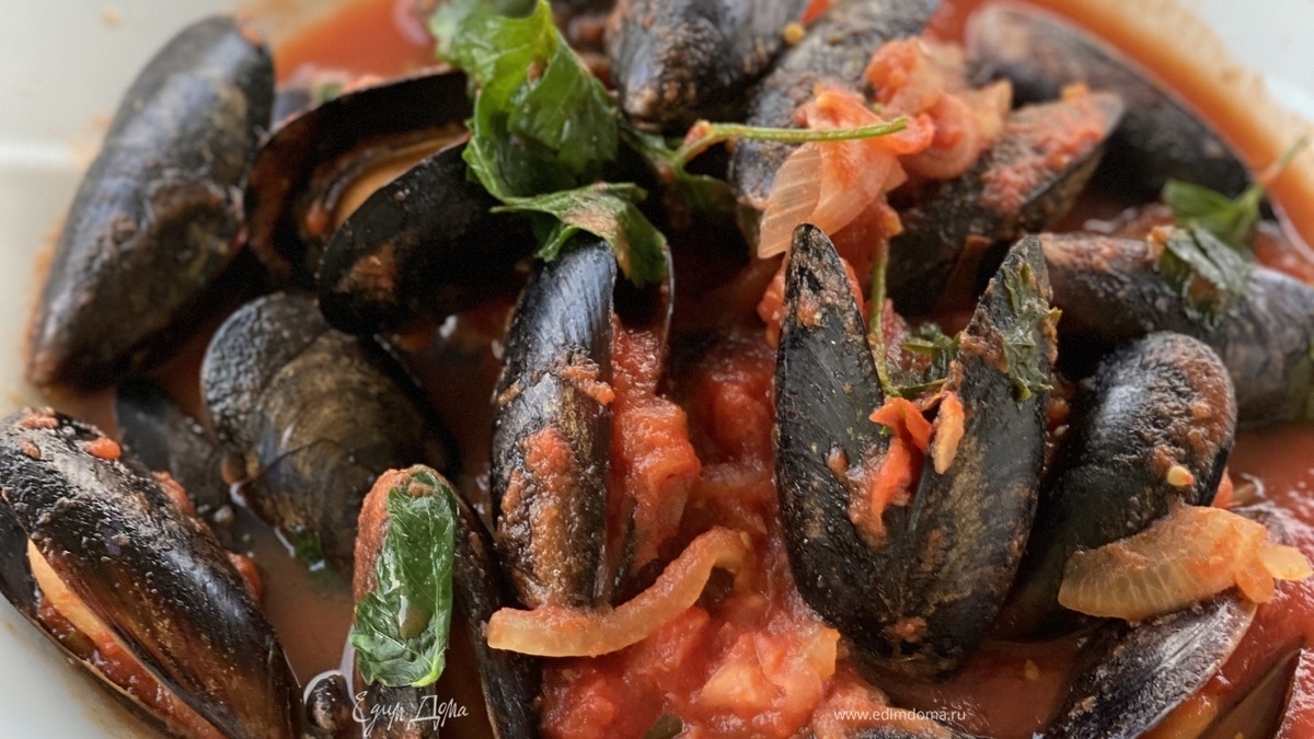 - Шаг 4Потом добавляем томатную пасту и немного воды, томим пару минут и затем в этот соус выкладываем мидии. Готовим 5 минут.