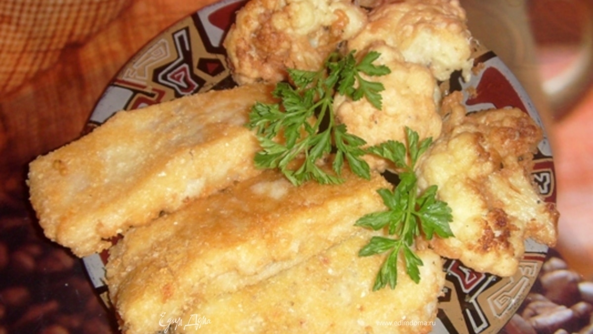 - Шаг 5Перед подачей можно сбрызнуть лимоном. Подавать лучше с овощами. В моём случае - это цветная капуста в кляре.
