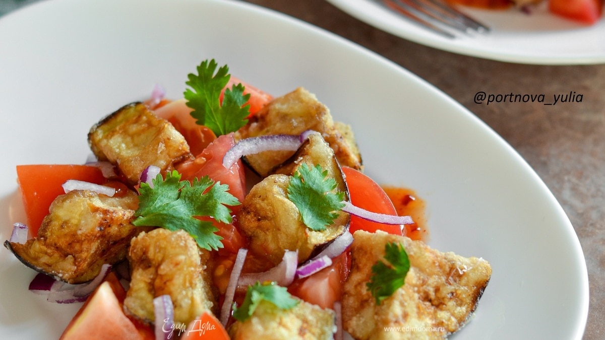 Теплый салат с хрустящими баклажанами и томатами. А сладкий соус