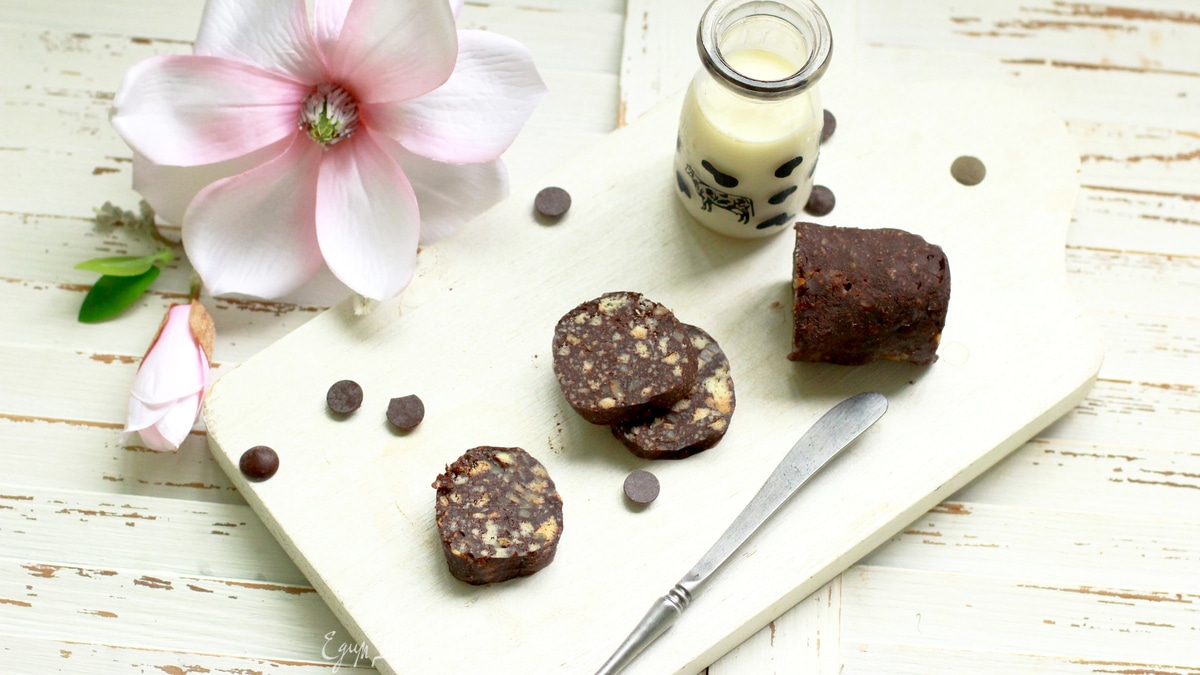 Очень вкусно вышло, совершенно неотличимо от обычной шоколадной колбасы с печеньем. Добавила молотый миндаль, он сюда очень