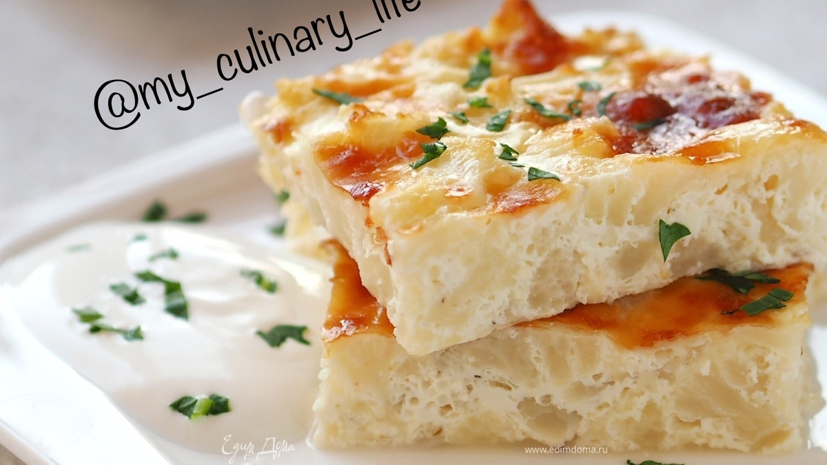 Запекать при 190–200°C до румяной корочки, около 35 минут. Подавать в теплом виде, нарезав порционно.