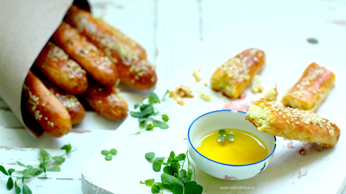 Положите палочки на застеленный пергаментом противень, смажьте взбитым желтком, посыпьте кунжутом. Поставьте противень в предварительно разогретую до 180°C духовку на 15 мин. - Шаг 5
