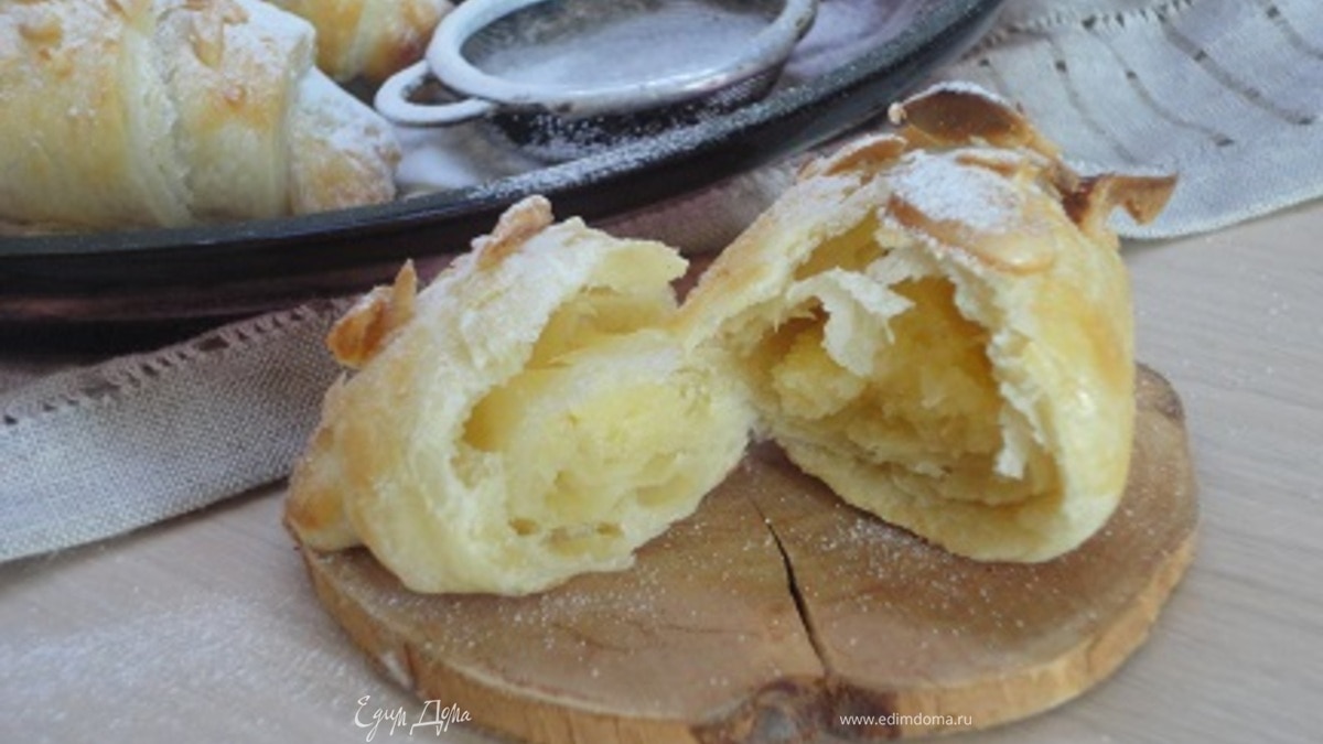 Готовое тесто размораживаем и раскатываем каждую часть в форму прямоугольника. Разрезаем на треугольники. Добавляем начинку в центр каждого по 1 ч. л. или по 1 кубику из формочек для льда. Защипываем начинку плотно, чтобы крем не вытек, и заворачиваем тесто. Выкладываем на противень. - Шаг 6