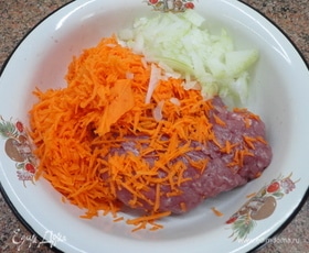 Для фарша морковь натрите на мелкой терке, лук порубите на мелкие кубики. Если не любите луковое послевкусие, предварительно обжарьте овощ. Посолите, поперчите. Добавьте любимые травы. У меня традиционно на такое количество фарша идет по ¼ ч. л. тимьяна, майорана и орегано. Хорошо перемешивайте в течение 3–5 минут. Уберите в холодильник на 30 минут.