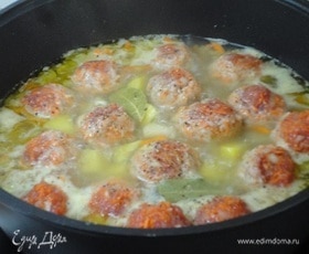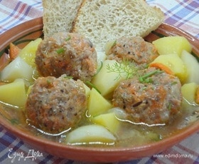 Фарш отбейте и сформируйте фрикадельки. Выложите их между кусочками картофеля. При необходимости добавьте воды. Доведите до кипения, убавьте нагрев, оставив медленное кипение до готовности картофеля и фрикаделек.
