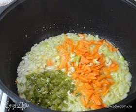 В сотейнике обжарьте 1 мелко нарезанную луковицу с морковью и чесноком. Можно использовать свежие или маринованные чесночные стрелки.