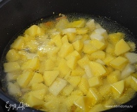 Картофель нарежьте средними кубиками и выложите в сотейник к овощам, залейте горячей водой, добавьте лавровый лист, посолите, доведите до кипения.