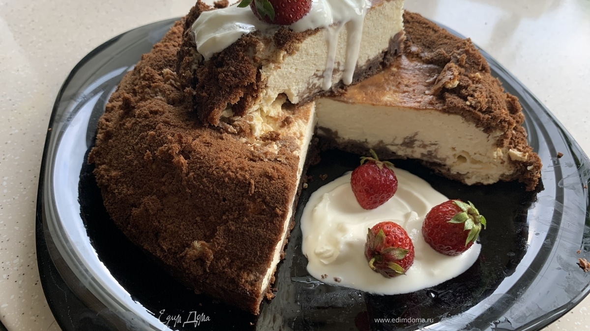Выпекаем 45 минут (лучше проверить на готовность) при 180°C. Оставляем в духовке с приоткрытой дверцей минут на 15. Спуск-подъем, как у обычных запеканок, не особо заметен, высота не теряется. Охладить, прежде чем перекладывать. Приятного аппетита!