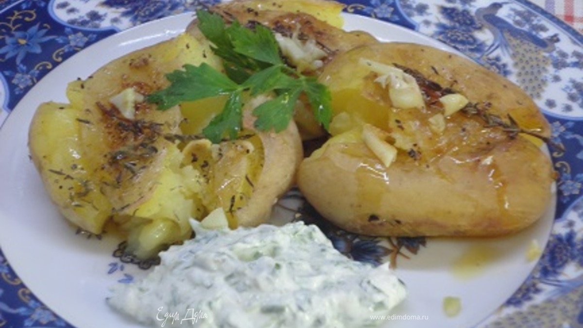 Пока картофель запекается, зелень (укроп, лук и петрушку) измельчить в блендере вместе с чесноком и соединить со сметаной. Посолить, поперчить, перемешать. Зеленый соус готов. - Шаг 5