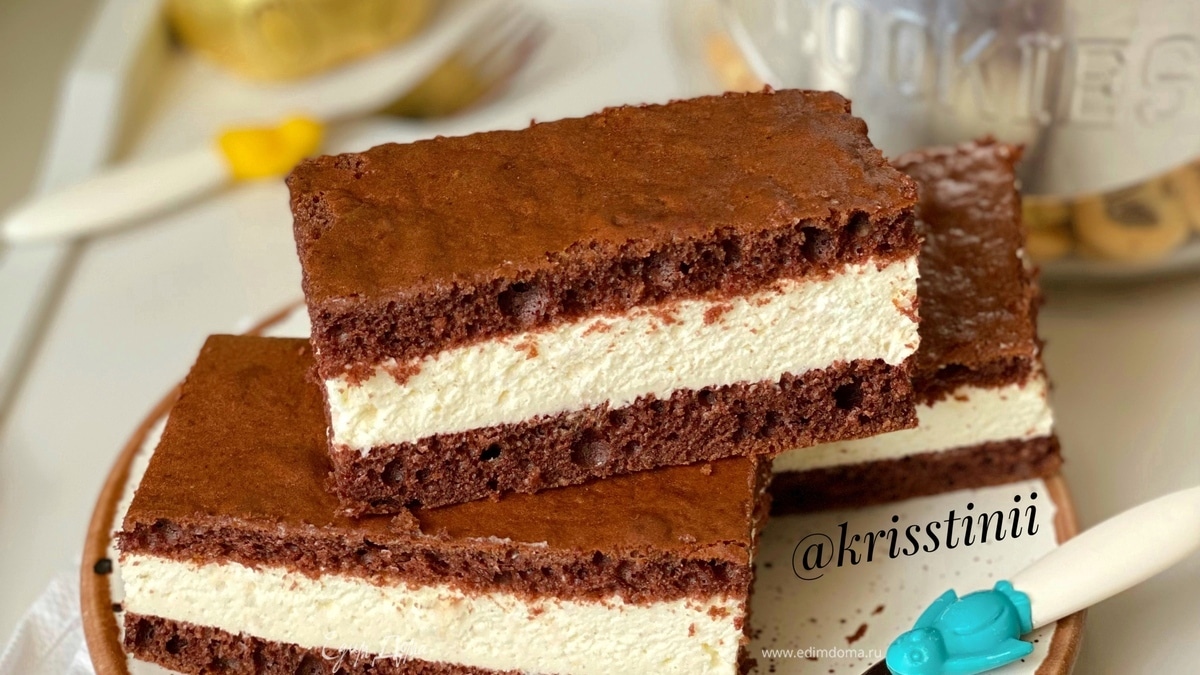 Форму подходящего размера застелить пищевой пленкой, поместить половину бисквита, распределить крем, накрыть второй половина бисквита. Убрать в холодильник на 3–4 часа, нарезать на прямоугольные ломтики. Готово!