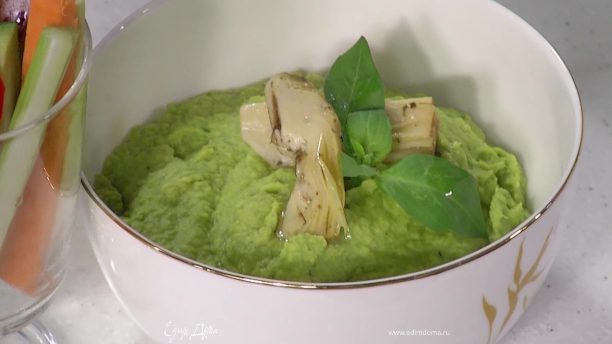 Готовый нут, шпинат, артишоки и чеснок выложить в чашу блендера, добавить пасту тахини, оливковое масло и сок лимона, все посолить и взбить в однородную, гладкую массу. - Шаг 6