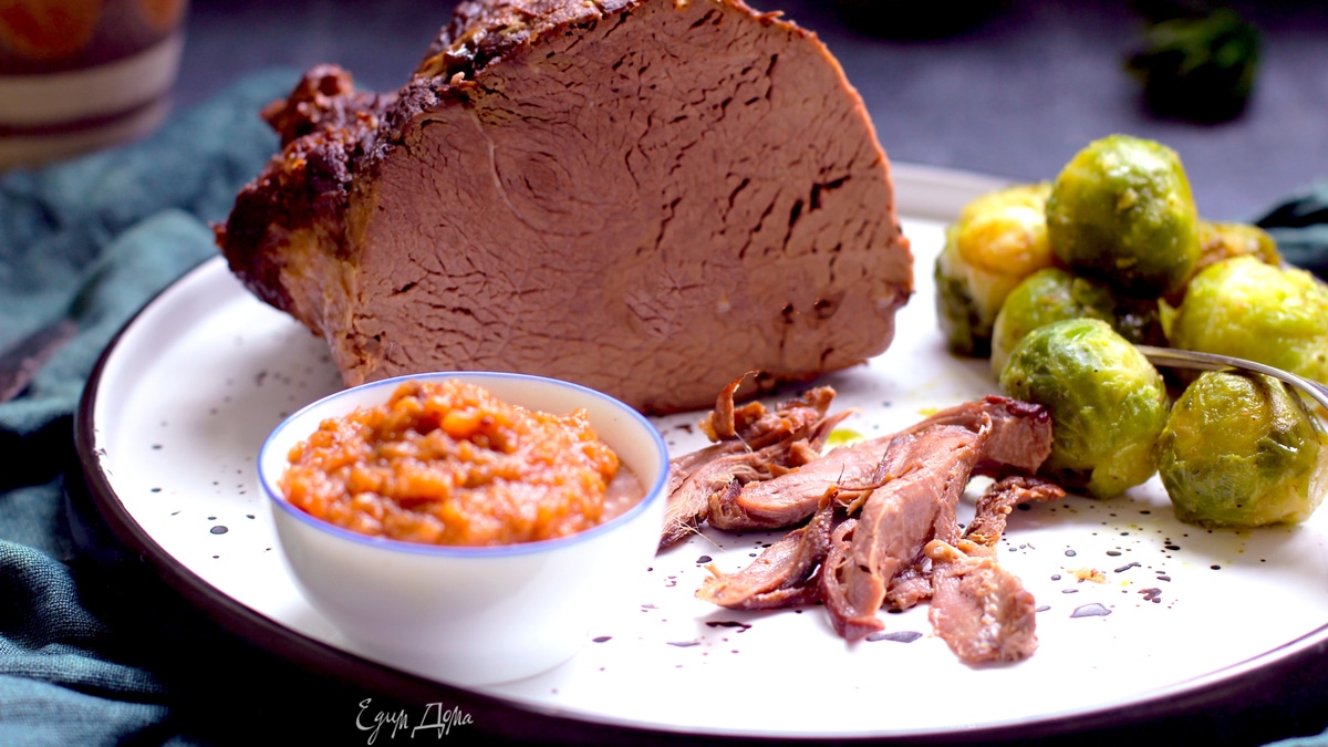 Подаем мясо тонко нарезанным, политым соусом, с полентой или картофельным пюре. Я подавала с обжаренной в оливковом масле с чесноком брюссельской капустой.
