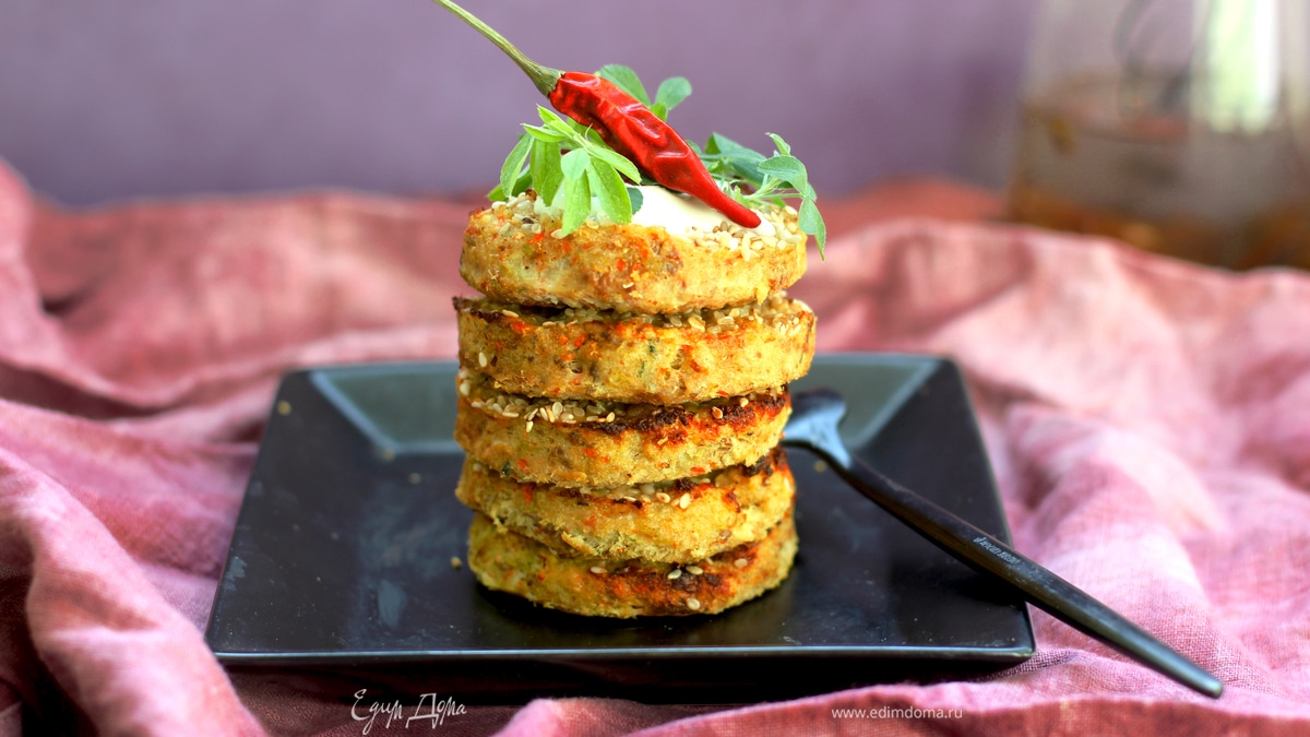 Сформировать с помощью кулинарного кольца круглые биточки на пергаменте, посыпать кунжутом. Выпекать в духовке минут 15–20 (до готовности) при температуре 180°C. - Шаг 3