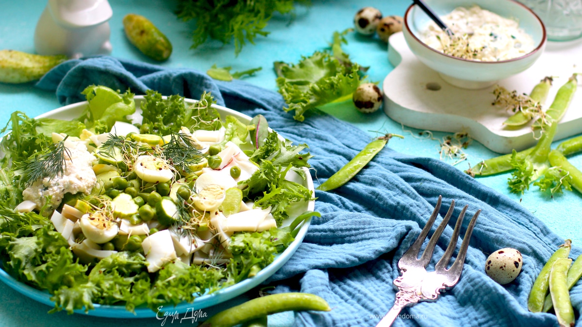 - Шаг 2Горошек залить кипятком на 5 минут, затем обдать ледяной водой. Яйца отварить и разрезать пополам (если обычное куриное — кубиком). Салат порвать руками. Сельдерей и огурцы нарезать небольшими кусочками или кубиком.