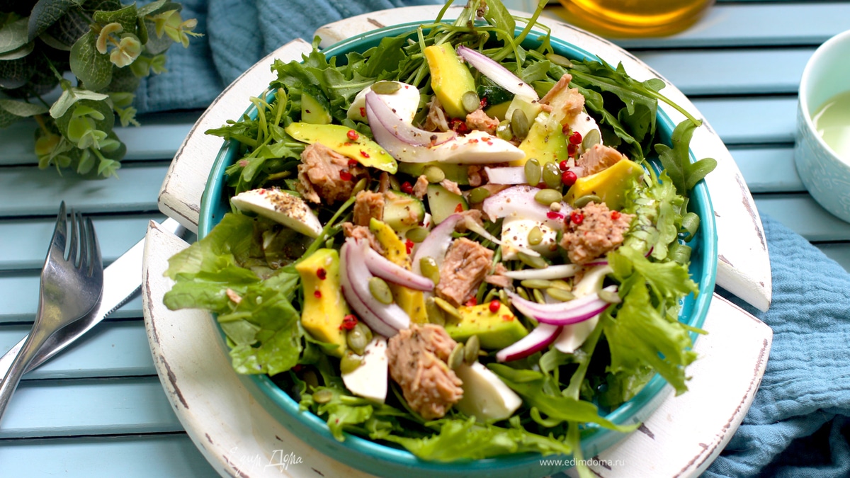 - Шаг 2Выньте моцареллу из маринада, нарежьте кусочками и выложите в салат. Добавьте кусочки тунца (масло слить, нам не понадобится). Добавьте нарезанный тонкими ломтиками лук. Оливки разрежьте пополам и посыпьте салат.