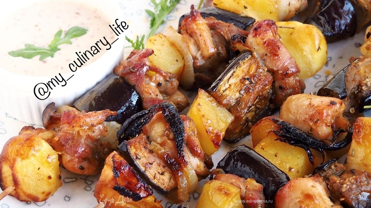 Духовку разогреть до 200°C, режим «Конвекция». Нанизать на шпажки мясо, чередуя с овощами и кольцами лука. Выложить на противень, застеленный пергаментом. - Шаг 4