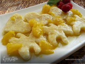 Подаем горячими, полив сливовым соусом. Для соуса в сотейнике с толстым дном на слабом огне прогреть сливу с сахаром. Крахмал развести в холодной воде, добавить к сливе и, постоянно помешивая, проварить до загустения пару минут.