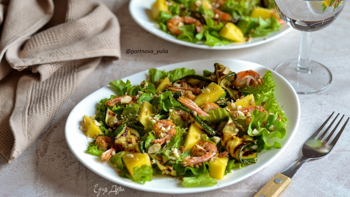 Сочетание манго и креветок — уже классика. Я решила разбавить салат цукини гриль, и эксперимент удался!