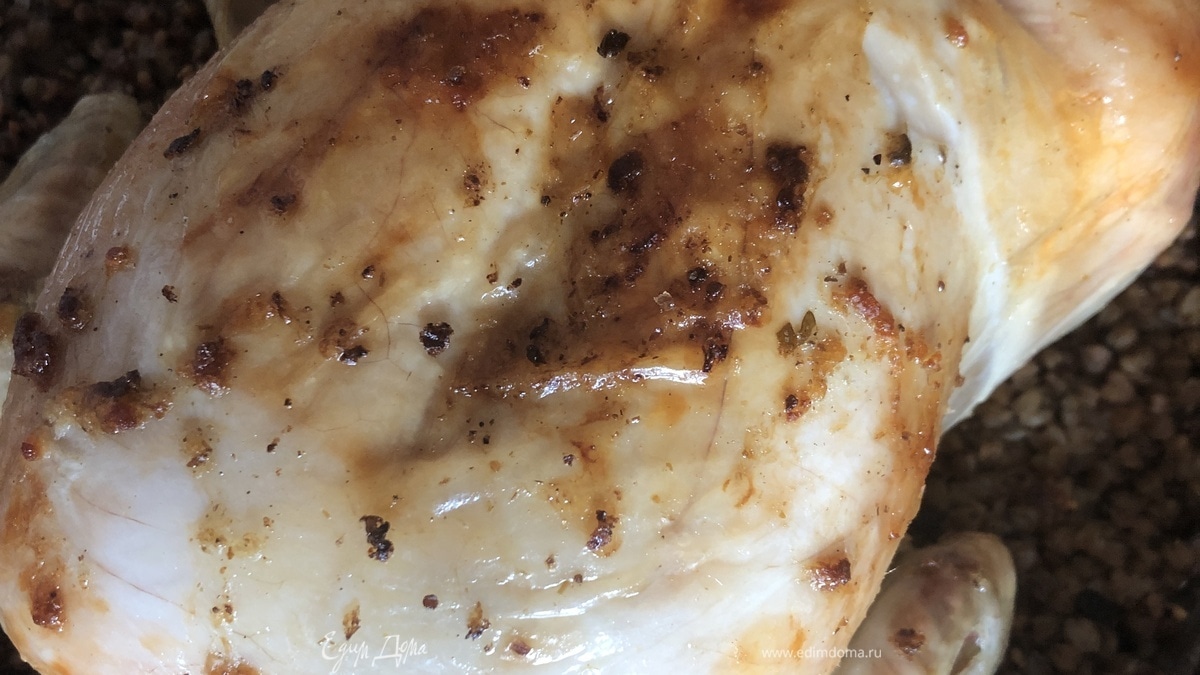 Накрыть листом фольги и поставить запекаться при 180°C на 1 час 20 минут. За 30 минут до готовности фольгу необходимо снять и вернуть курицу в духовку запекаться до готовности. Приятного аппетита!