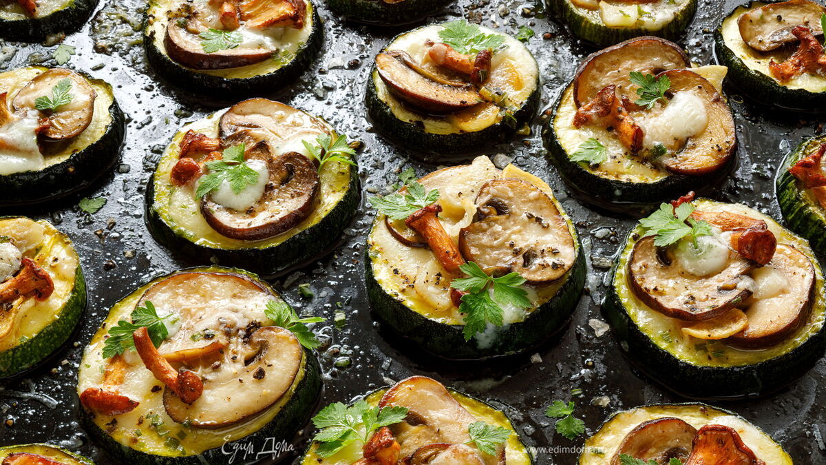 Одно из главных преимуществ кабачков — мягкий, деликатный вкус, который отлично гармонирует с другими овощами, мясом, яйцами, сыром. Чаще всего на стол кабачки подают в жареном, маринованном или тушеном виде. Также этот овощ можно быстро запечь в духовке. А чтобы закуска получилась более интересной, добавим в рецепт грибы. Подойдет это блюдо быстрого приготовления и для диетического меню, так как калорийность кабачков с грибами в запеченном виде совсем небольшая. Берите на заметку рецепт быстрой и вкусной закуски.