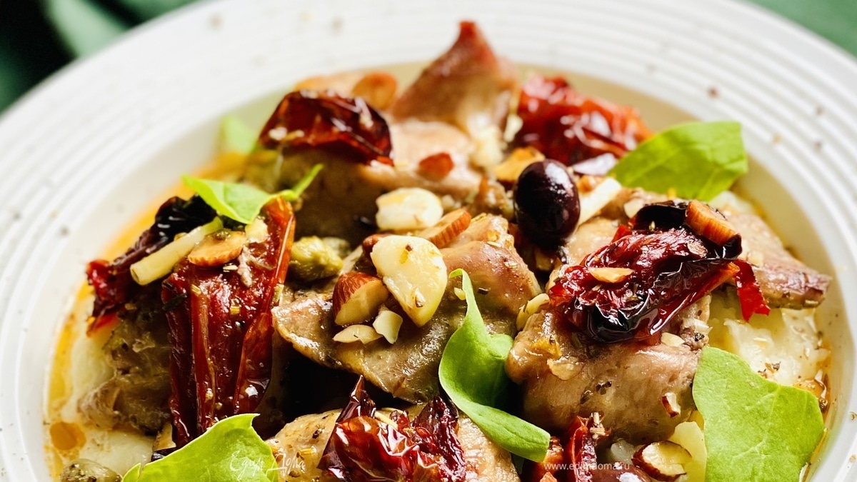 За 15 минут до конца запекания к мясу добавить оливки, каперсы, вяленые помидоры и посыпать орехами. Идеальный гарнир для этого блюда — картофельное пюре. Выложить на него индейку и полить соусом от мяса!