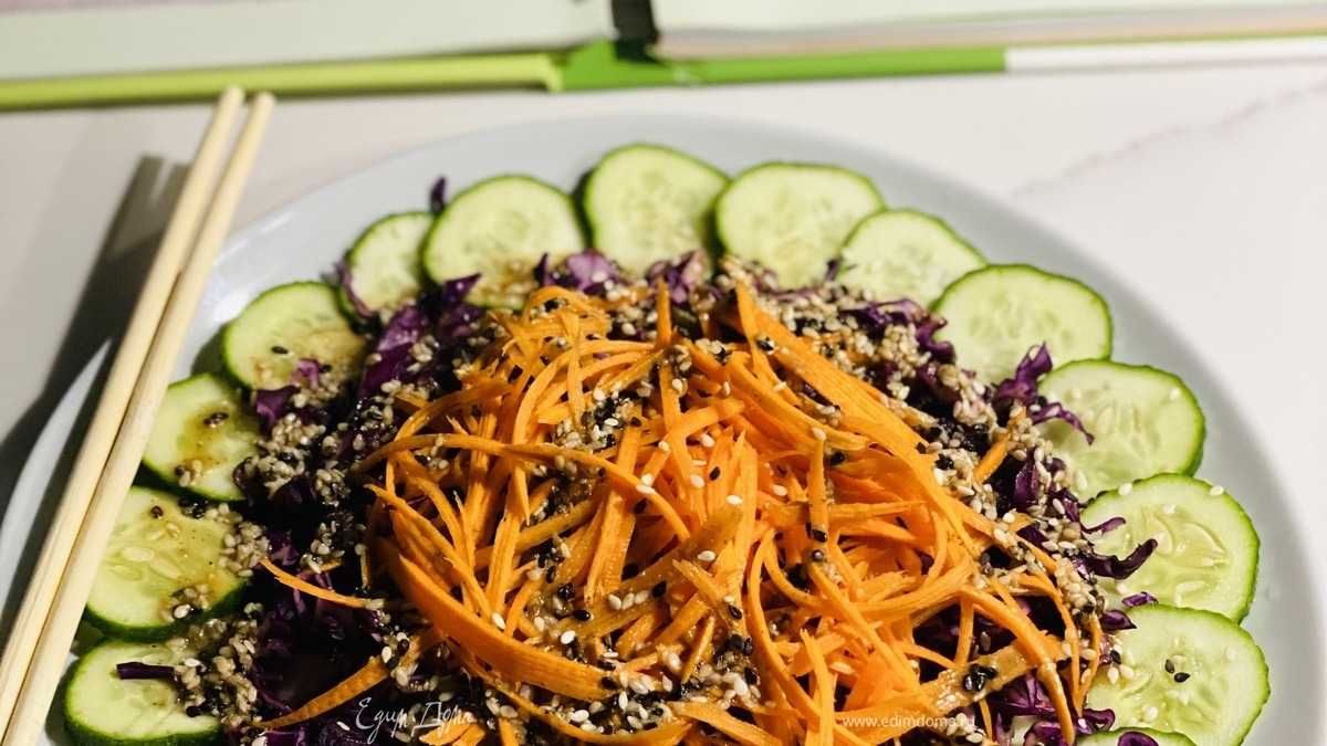 Салат из красной капусты и огурца с кунжутной заправкой