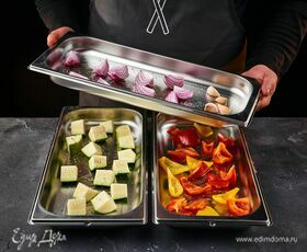 На комби-пароварке Miele выберите «Приготовление блюд меню», затем «Цукини», «Паприка», «Лук». Далее следуйте инструкциям прибора.<br /> В обычной духовке запекайте овощи при 180°С около 20 минут.